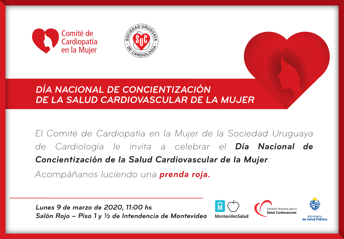 El Comité de Cardiopatía en la Mujer de la Sociedad Uruguaya de Cardiología invita a celebrar el Día Nacional de concientización de la salud cardiovascular de la mujer este 9 de marzo de 2020. La celebración comenzará en el salón rojo de la Intendencia de Montevideo a las 11:00 am, con actividad posterior de promoción de salud en la explanada de la IM.