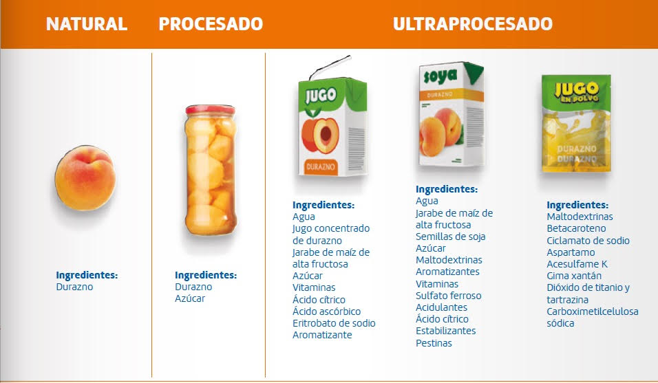 Son atractivos, duraderos y sabrosos pero pierden calidad nutricional, suelen tener poca fibra, vitaminas y minerales. En resumen, el producto natural pierde su balance. Por ejemplo, en los jugos industrializados de fruta. Por el alto grado de procesamiento de la fruta se pierden su fibra, vitaminas y minerales y se agregan azúcar y jarabes.
