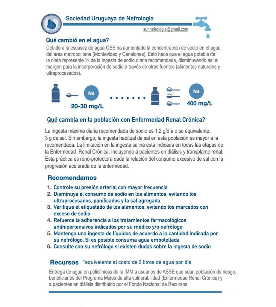 - Las personas que presentan insuficiencia cardiaca y enfermedad renal crónica, a estos consejos prácticos se suma la recomendación de evitar el consumo de agua de OSE y sustituirlo por el de agua mineral.