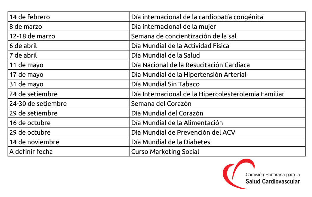 Ver comunicado del 13 de junio de 2018 Ante versiones surgidas referentes al Programa Espacio Cardioprotegido, la Comisión Honoraria para la Salud Cardiovascular comunica que: