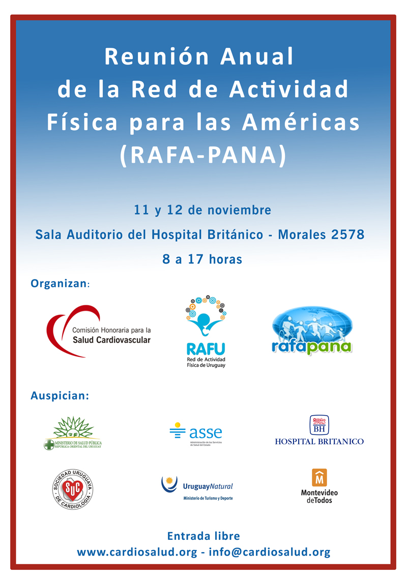 La Reunión Anual de la Red de Actividad Física de las Américas (RAFA) se realizará en Montevideo - Uruguay, los días 11 y 12 de Noviembre de 2013. Lugar: Sala Auditorio Hospital Británico calle Morales 2578 Inscripción sin costo info@nuevo.cardiosalud.org 24802715 - 24815929 de 13:00 a 19:00 horas