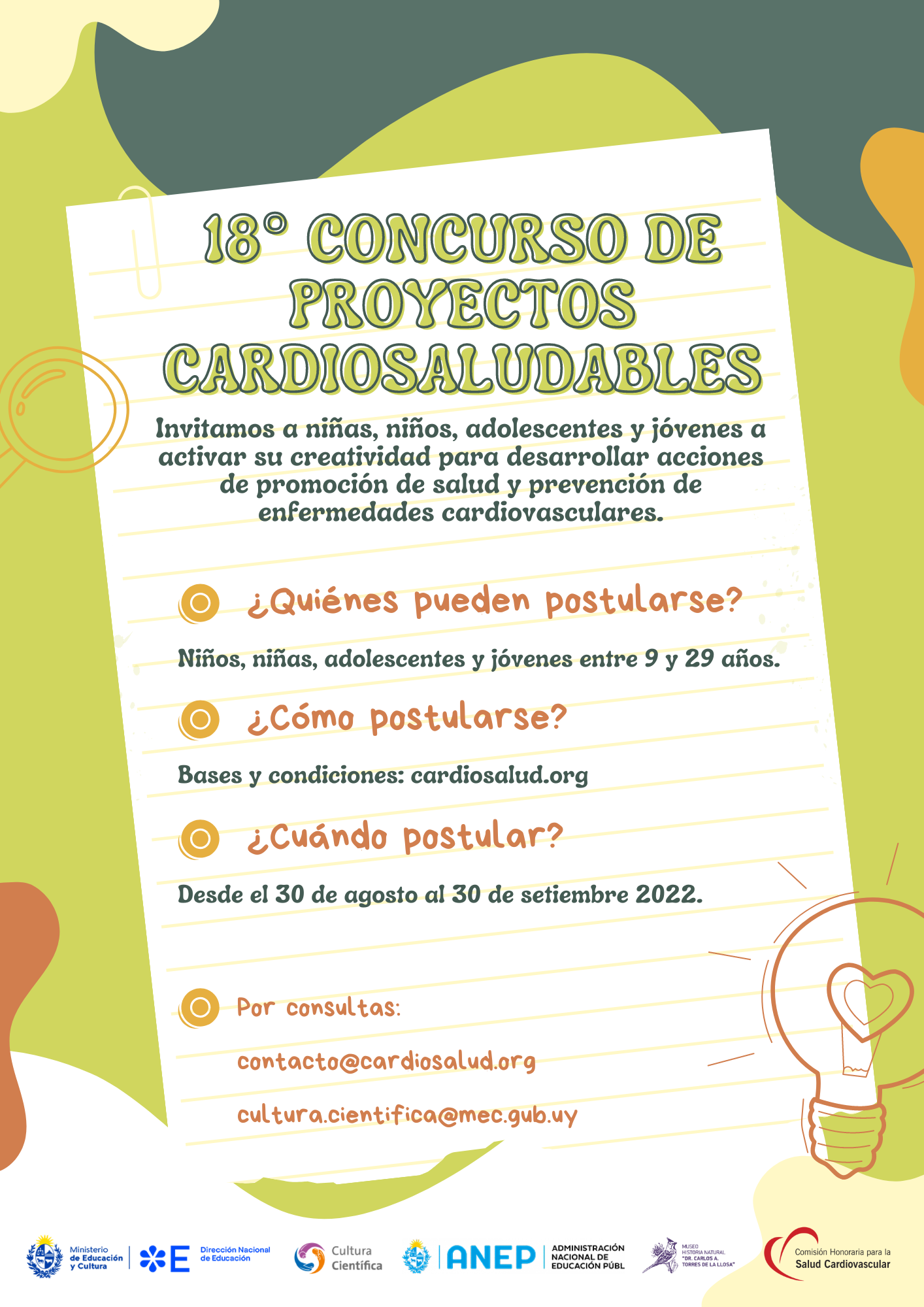 La Comisión Honoraria para la Salud Cardiovascular, Cultura Científica de la Dirección de Educación del MEC y la Administración Nacional de Educación Publica/CDC, convocamos al XVIII Concurso Juvenil de Proyectos Cardiosaludables, en el marco de Semana del Corazón 2022.