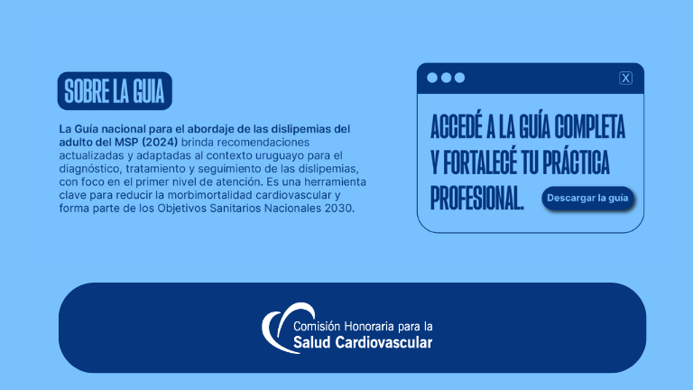 La Comisión Honoraria para la Salud Cardiovascular difunde la “Guía nacional de recomendaciones para el abordaje de las dislipemias del adulto» del MSP, con el mensaje “DETECTAR – TRATAR – PREVENIR”, expresando en tres pasos clave el abordaje recomendado por la guía, reforzando el papel esencial de los profesionales de la salud en la identificación temprana y el tratamiento adecuado de las dislipemias, que a su vez, son parte fundamental en la prevención efectiva de los eventos cardiovasculares.