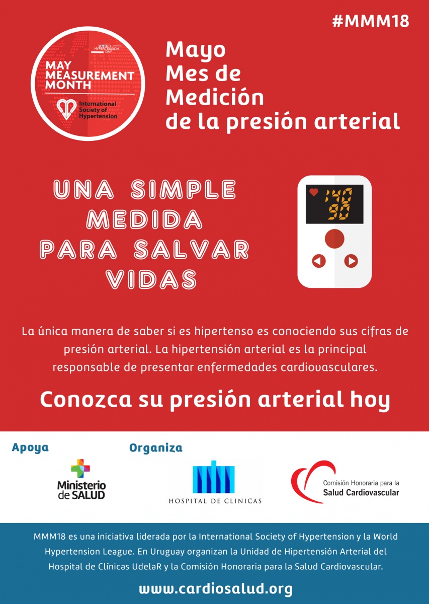 Alineando a las acciones mundiales, por segundo año se viene realizando la campaña Mayo Mes de Medición de la Presión Arterial (MMM18), iniciativa liderada por la International Society of Hypertension y la World Hypertension League. En Uruguay la organizan la Unidad de Hipertensión Arterial del Hospital de Clínicas UdelaR y la Comisión Honoraria para la Salud Cardiovascular con el apoyo del Ministerio de Salud.
