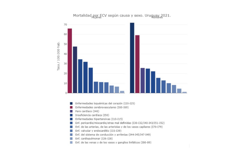 Según el informe de mortalidad por enfermedades cardiovasculares 2021 de la Comisión Honoraria para la Salud Cardiovascular, las enfermedades cerebrovasculares fueron la primera causa de muerte en el Uruguay con una tasa de 62,6/100.000 habitantes. Cuando se discriminan las diferentes causas, nos encontramos que las enfermedades cerebrovasculares están en primer lugar para el sexo femenino y en segundo lugar, luego de las isquémicas del corazón, para el sexo masculino (2).