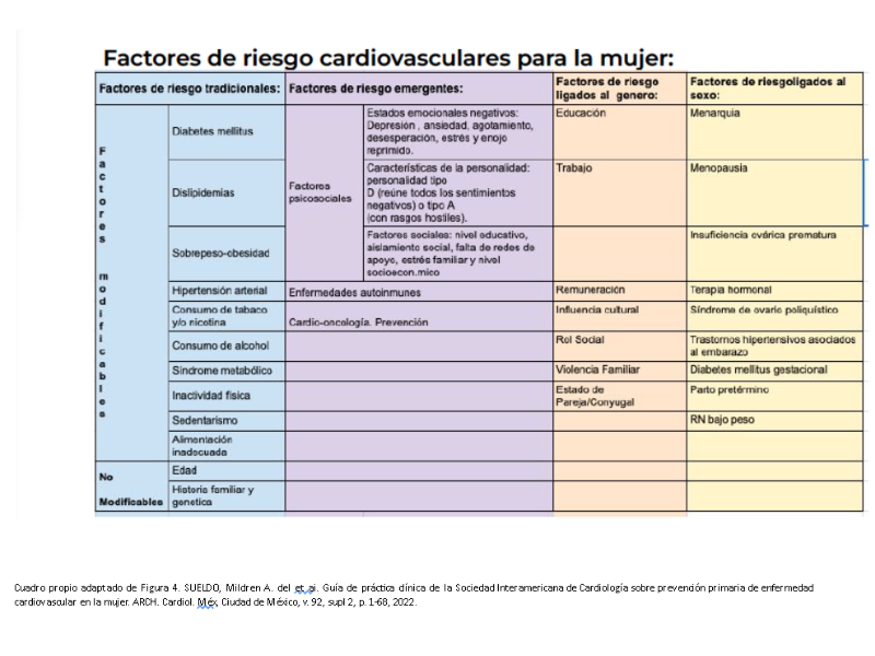 Además de los factores de riesgo comunes en ambos sexos (hipertensión arterial, diabetes, consumo de tabaco y alcohol, sobrepeso/obesidad, dislipemia, síndrome metabólico, inactividad física, sedentarismo, alimentación inadecuada), las mujeres presentan factores de riesgo específicos relacionados con su biología y su rol en la sociedad.