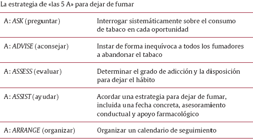 El tabaquismo aumenta el riesgo de DM2, enfermedad cardiovascular y muerte prematura, por lo que se debe evitar. El abandono del tabaco reduce el riesgo de enfermedad cardiovascular. Se recomienda ofrecer a los sujetos fumadores con DM un programa estructurado para dejar de fumar que incluya apoyo farmacológico si es necesario (p. ej., bupropión y vareniclina). Se debe proporcionar instrucciones detalladas sobre abandono del hábito tabáquico según los principios de las cinco A.