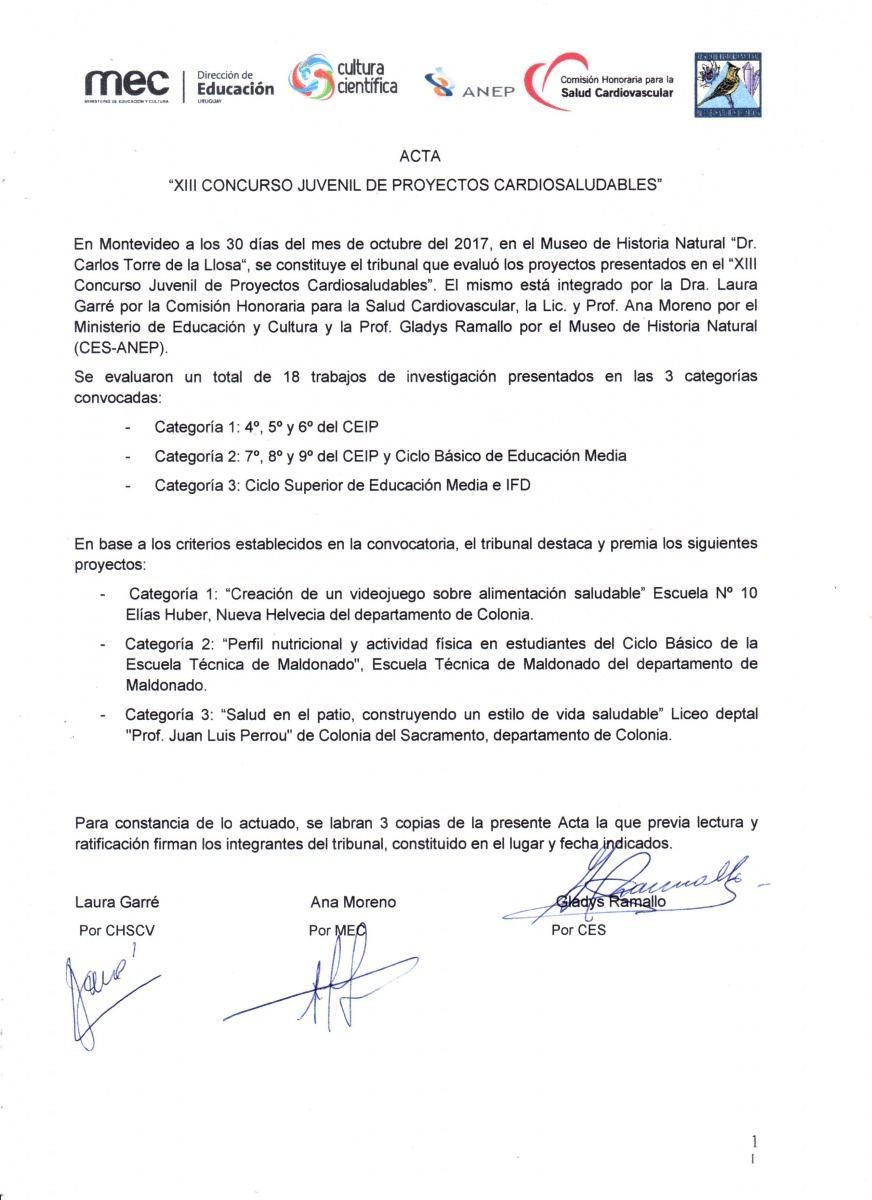 El tribunal estuvo integrado por la Dra. Laura Garré por la Comisión Honoraria para la Salud Cardiovascular, la Lic. y Prof. Ana Moreno por el Ministerio de Educación y Cultura y la Prof. Gladys Ramallo por el Museo de Historia Natural (CES-ANEP).