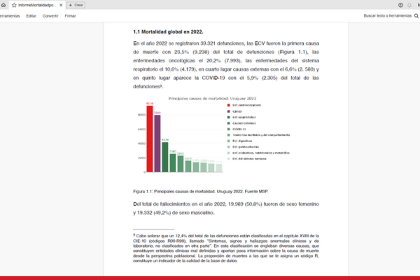 La Comisión Honoraria para la Salud Cardiovascular publica, en el día de hoy, el informe realizado por el Área de Epidemiología y Estadística de nuestra institución. El presente informe da cuenta de la situación de la mortalidad en Uruguay en el año 2022, poniendo especial énfasis en las defunciones que tienen como causa las enfermedades cardiovasculares.