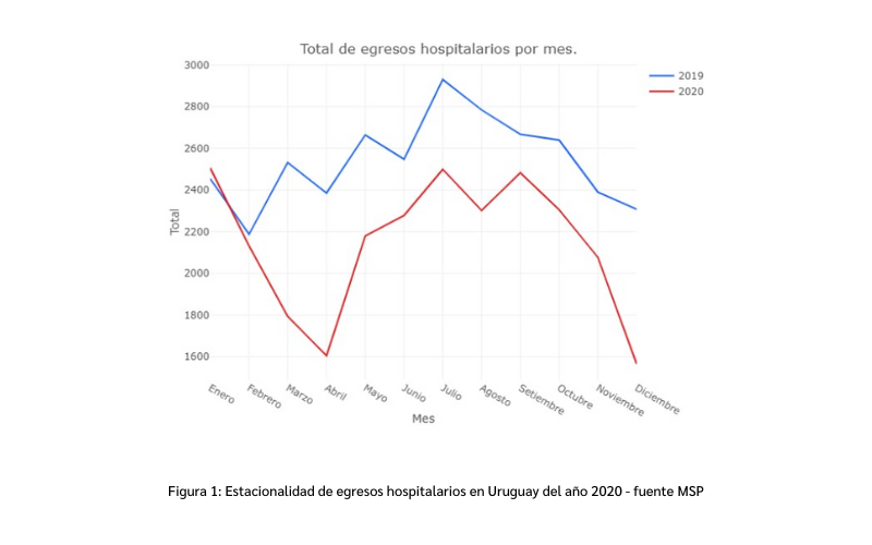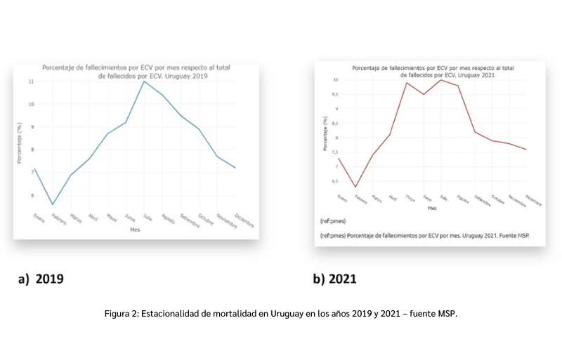La enfermedad cardiovascular tiene un comportamiento estacional y en Uruguay el máximo de internaciones y muertes se dan en los meses fríos del año (de mayo a agosto); siendo el pico de eventos, tanto de internaciones como de mortalidad en el mes de julio (1,2,3). La figura 1 muestra la estacionalidad de los egresos hospitalarios en el Uruguay y la figura 2 la de mortalidad.