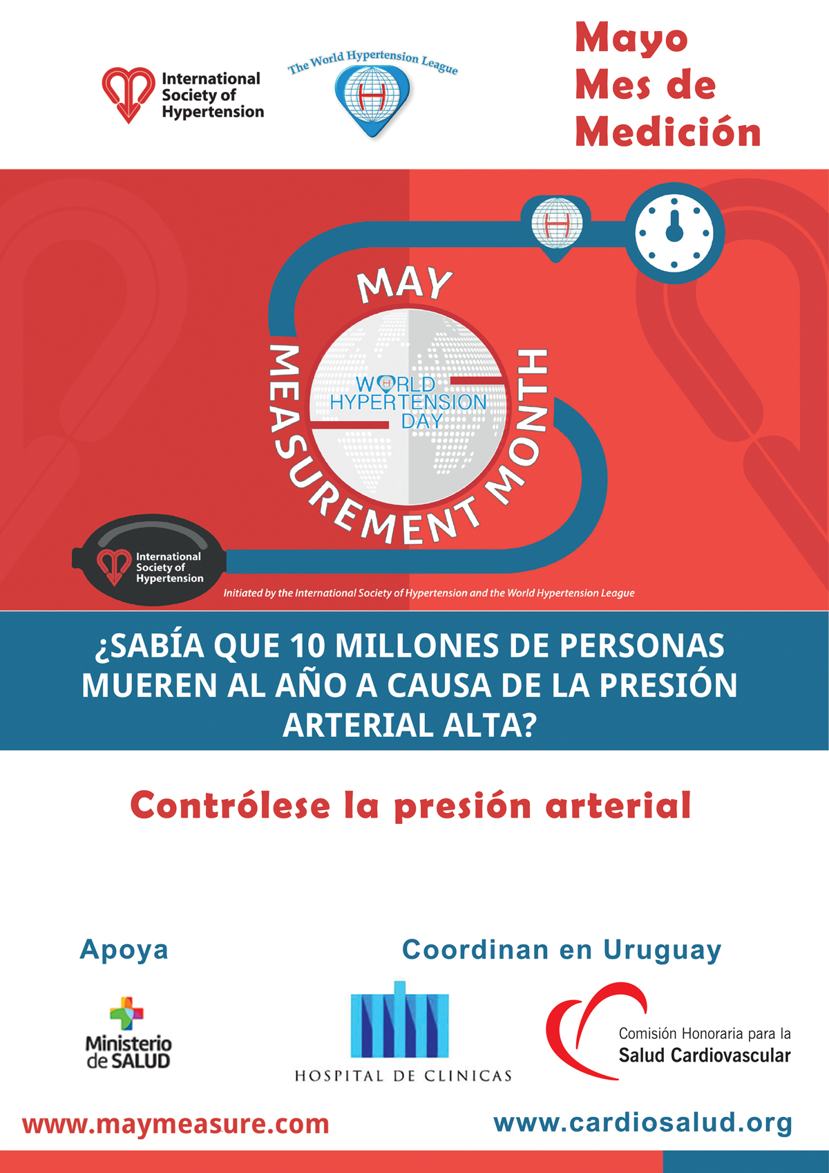 Uruguay se suma a la iniciativa mundial «Mayo Mes de Medición» de hipertensión arterial para aumentar la conciencia sobre esta enfermedad. El objetivo es la toma de presión de 25 millones de adultos en más de 100 países del 1 al 31 de mayo de 2017. En Uruguay apuntamos a la toma de presión de 30 mil personas. Con esta campaña apuntamos a que miles de uruguayos conozcan sus cifras de presión arterial y  en el caso que tengan cifras alteradas saber qué hacer a continuación.