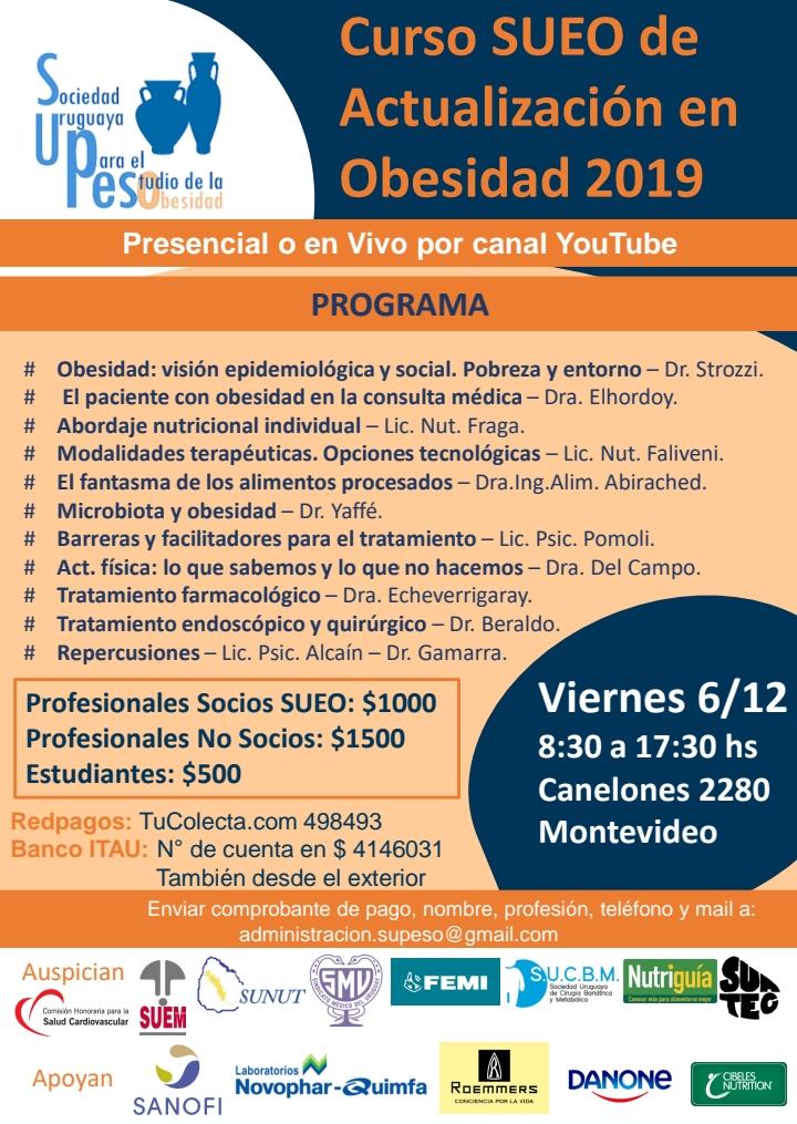 El Curso Actualización en Obesidad 2019 organizado por la Sociedad Uruguaya para el Estudio de la Obesidad, presencial o en vivo, se realizará el viernes 6 de diciembre de 8:30 a 17:30 hrs, en Canelones 2280. Programa 8:30 a 8:35 – Bienvenida – Dra. Adela González B. Master en Nutrición Clínica. Master en Medicina Familiar y Comunitaria. Presidente de la Soc.…