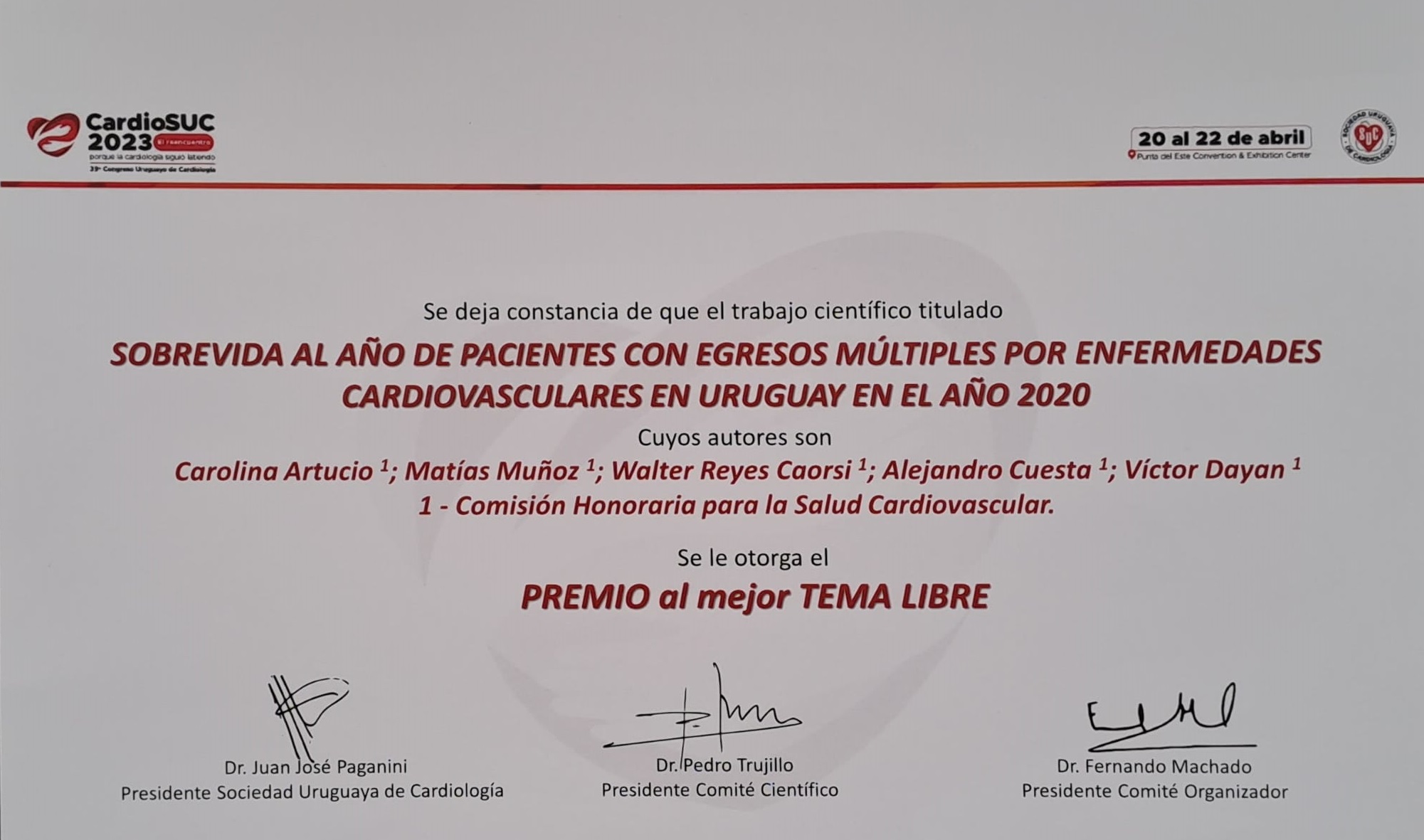 En el marco del 39° Congreso Uruguayo de Cardiología, la Comisión Honoraria para la Salud Cardiovascular recibe el Premio al mejor tema libre, por el trabajo científico “Sobrevida al año de pacientes con egresos múltiples por enfermedades cardiovasculares en Uruguay en el año 2020”.