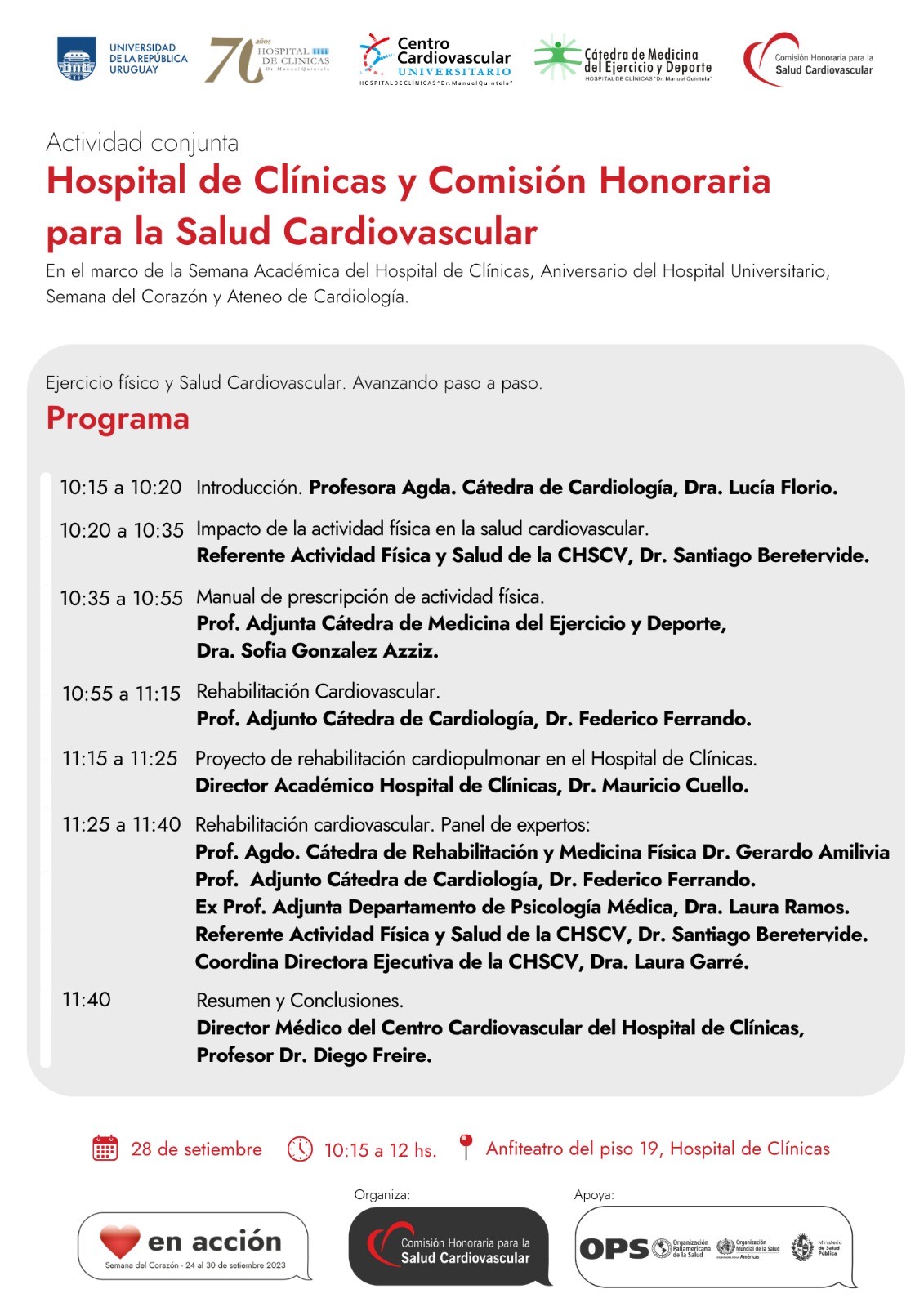 La actividad titulada “Ejercicio física y Salud Cardiovascular, avanzando paso a paso”, se realizó el jueves 28 de setiembre del 2023 en el Hospital de Clínicas, en su Anfiteatro del piso 19.