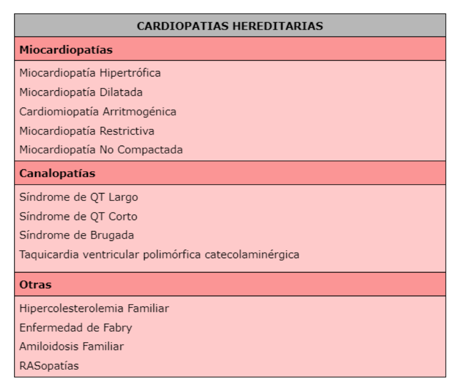 Las Cardiopatías Hereditarias (CH) son un grupo heterogéneo de enfermedades cardiovasculares de base genética, que incluye miocardiopatías, canalopatías, enfermedades de la aorta, enfermedades de depósito (en las que el corazón es uno de los órganos afectados), y otras como la hipercolesterolemia familiar.