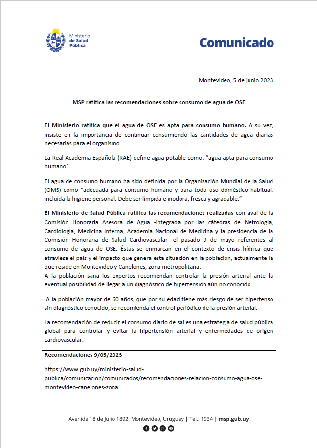 Ratificación de las recomendaciones sobre consumo de agua de OSE