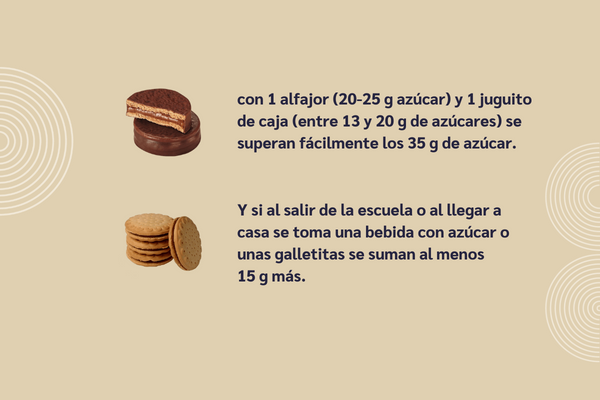 Los alfajores, galletitas, budines, jugos de caja o panificados como bizcochos, o también los cereales de desayuno, en especial aquellos dedicados a los más chicos, o los dulces en barra, o el dulce de leche, o yogures son ejemplos de productos que al ingerirlos producen una descarga enorme de azúcar en el organismo.