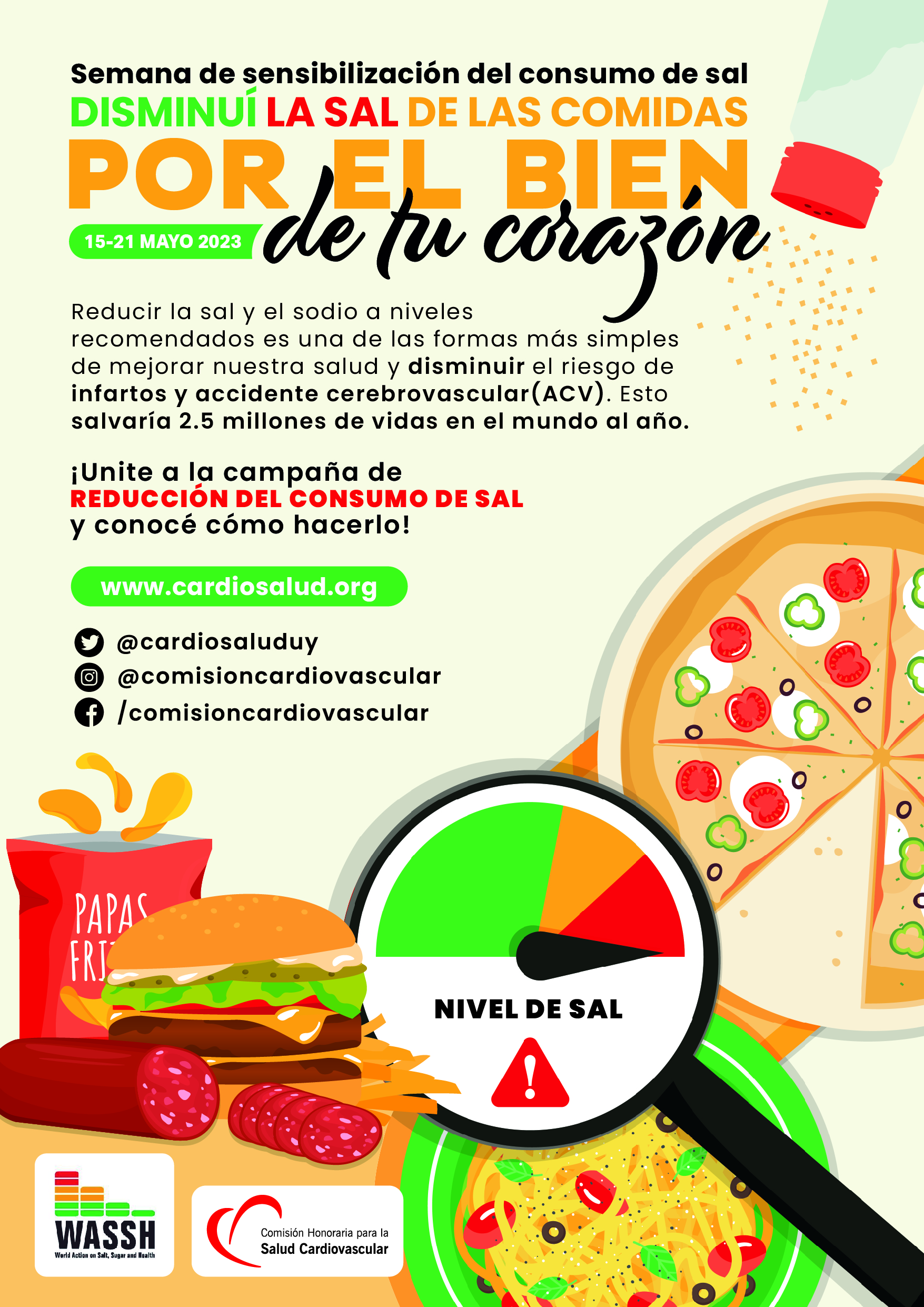 A partir de este año, 2023, se ha establecido que esta Semana Mundial se conmemore en el mes de mayo. La Comisión Honoraria para la Salud Cardiovascular (CHSCV)se suma una vez más desde el 2017, a la campaña mundial para reducir el consumo de sal/ sodio, haciendo eco en el lema “Disminuir la sal y el sodio de las comidas, por el bien de tu corazón”.